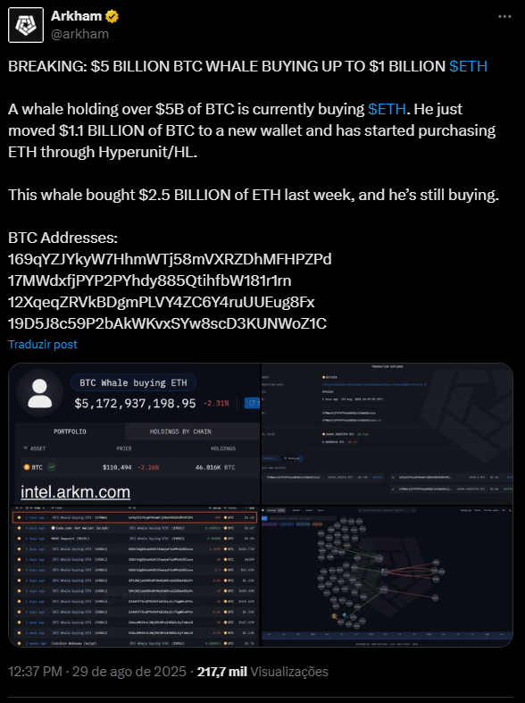 Em suma, após converter todo o saldo, a baleia transferiu o Ethereum para carteiras externas, repetindo uma estratégia vista na semana anterior. Segundo a Arkham Intelligence, o endereço pertence a um grupo que gerencia US$ 5 bilhões em Bitcoin, além de ter movimentado US$ 800 milhões recentemente na plataforma Hyperunit, que integra Bitcoin e Ethereum à Hyperliquid para negociações avançadas.
