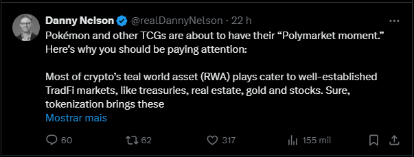 Em suma ele afirma que “Pokémon e outros TCGs estão prestes a ter seu ‘momento Polymarket’”, indicando que a tecnologia tende a ganhar força e novos modelos econômicos, longe de ser só uma moda passageira.