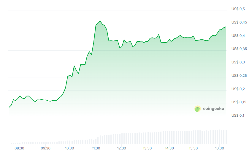Às 9h, o CLO estava cotado a US$ 0,157. Duas horas depois, já marcava US$ 0,329. No auge, o ativo atingiu US$ 0,4606, com volume ultrapassando US$ 48 milhões no início da tarde. O preço se estabilizou em US$ 0,4068 (+194% nas últimas 24h).
